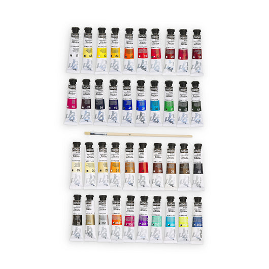 Set includes: titanium white, opaque primary yellow, cadmium red hue, primary magenta, dark ultramarine blue, opaque primary cyan, phthalocyanine green, yellow ochre, Mars black, cadmium orange hue, azo pink, oriental violet, turquoise blue, cadmium green hue, ivory, burnt umber, Payne's grey, medium cadmium yellow hue, quinacridone scarlet, naphtol carmine, Naples yellow hue, raw sienna, red ochre, burnt sienna, silver, gold, iridescent violet-blue, iridescent red-blue, iridescent green-blue, iridescent green-yellow, iridescent orange-yellow, iridescent blue-green, iridescent blue-black, light azo yellow, transparent vermilion, Prussian blue hue, cerulean blue, Hooker’s green, Venice yellow, Venice red
