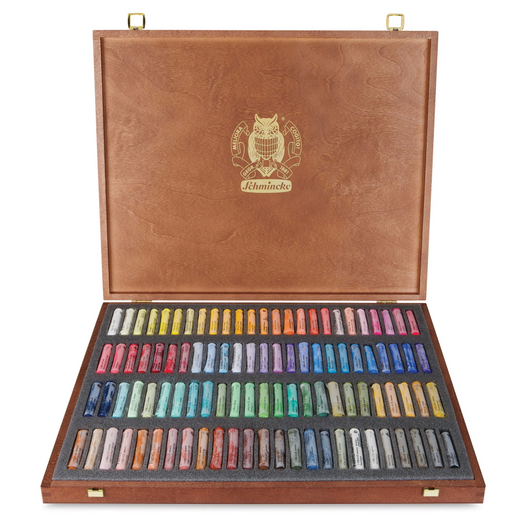 Schmincke soft pastels contain the finest artists' pigments in the highest concentration using a minimum of binders. The extreme softness and colour strength of Schmincke pastels demand a very traditional and costly forming process as well as labelling by hand. The colour range includes 400 tones classified in 80 rows with 5 colours each. The complete assortment also contains 5 additional pearl lustre effect colours.